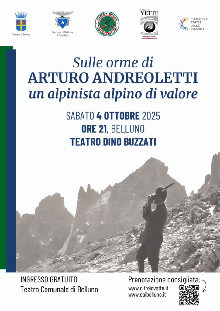 Arturo Andreoletti è stato un autentico protagonista della storia dell’alpinismo italiano. Sulle Dolomiti bellunesi, ha compiuto memorabili salite che hanno dischiuso le grandi stagioni alpinistiche degli anni Venti e Trenta. A Belluno lo lega in particolare l’affetto per la Gusela del Vescovà sulla Schiara che ha salito per primo nel 1913. Ma la sua grande impresa è stata la prima salita della parete nord-est dell’Agner, nel 1921 con la guida Francesco Jori e Renato Zanutti. Da ufficiale degli Alpini Andreoletti ha combattuto il primo conflitto mondiale sulla Marmolada, sulle Tofane, sul Monti Tomba e sul Col Moschin alle pendici del Monte Grappa. Finita la guerra è stata una figura centrale della nascita dell’Associazione Nazionale Alpini. L’idea di ricordare la figura dell’alpinista- alpino Arturo Andreoletti ha messo in moto un articolato lavoro di ricerca negli archivi del CAI e dell’ANA che si è concluso con l’allestimento di un corollario di testimonianze, scandite da immagini e accompagnate dalle armonie di una fisarmonica.