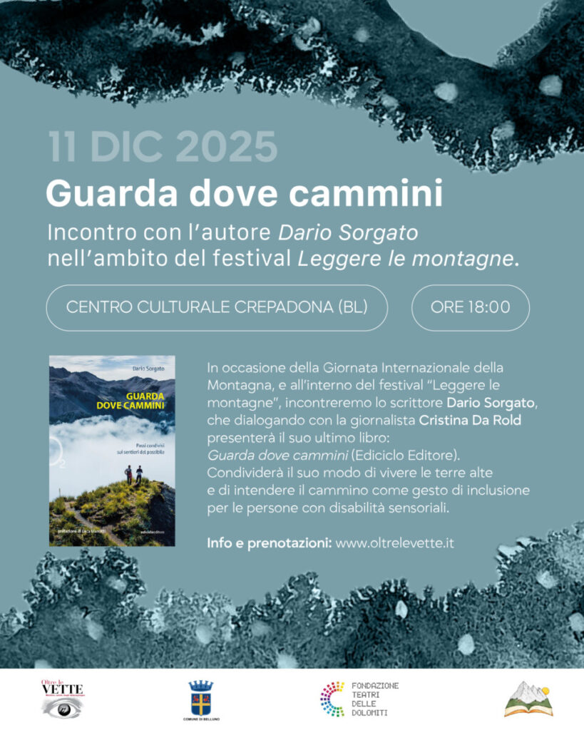 Dario Sorgato, autore del libro “Guarda dove cammini” (ed. Ediciclo 2025), sarà ospite della rassegna Oltre le Vette giovedì 11 dicembre 2025 al centro culturale Crepadona (alle 18). L’incontro avverrà in occasione della Giornata internazionale della Montagna ed è inserito nel festival internazionale “Leggere le montagne”.